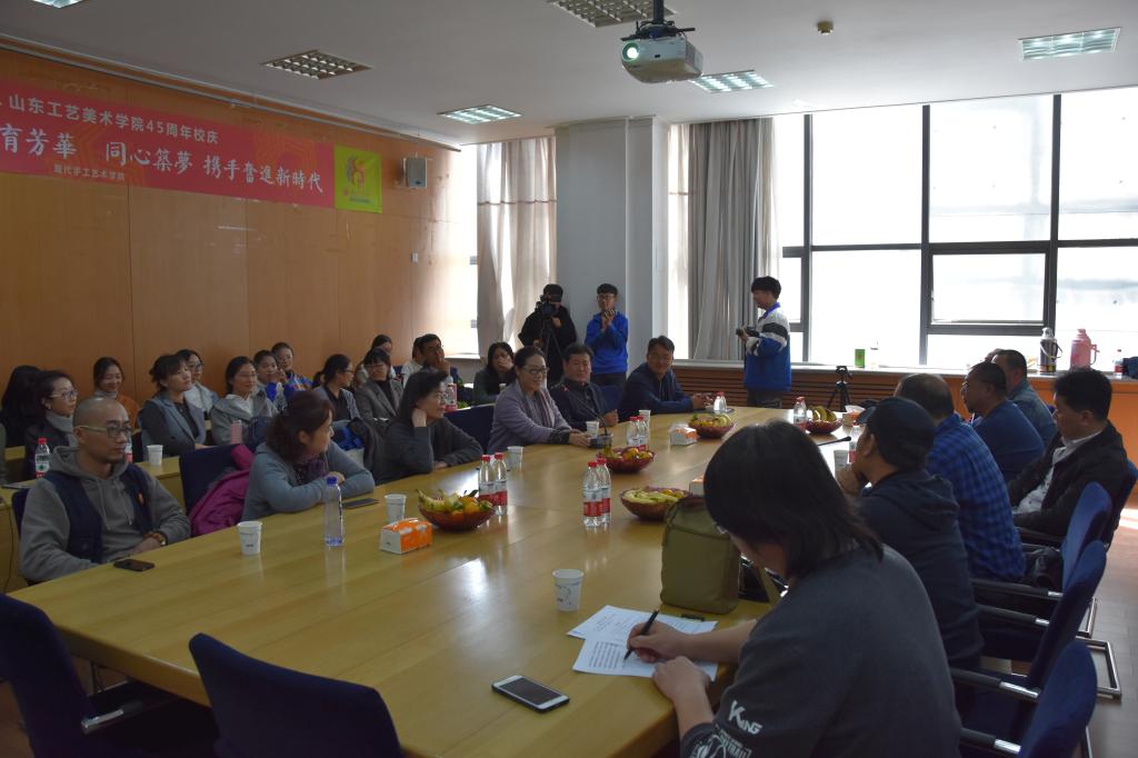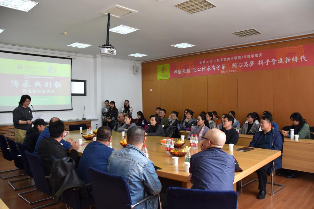 10月26日上午,现代手工艺术学院举办建校45周年校庆活动之“传承与创新”师生校友座谈会。济南校友会副会长、原山东工艺美术研究所所长王勇,山东华艺雕塑艺术股份有限公司董事长傅绍湘,青岛和力传媒集团CEO林剑刚,枣庄学院美术与艺术设计学院郭炜教授,86级校友、山东潍坊明奇纺织进出口公司总经理张传奇、84级校友青岛昱方林实业有限公司总经理杨发丛等校友以及学院院长赵进、党总支书记金伟、副院长宋处岭、副书记王国燕出席和学院教师代表参加座谈会。副院长宋处岭主持会议。
