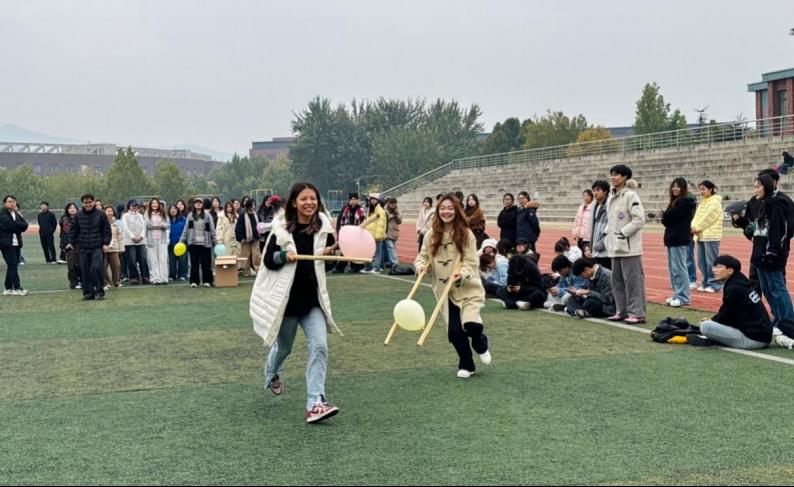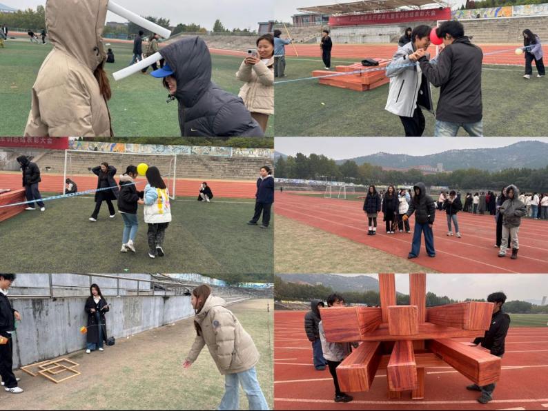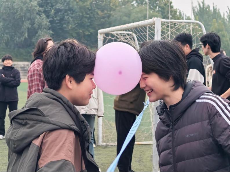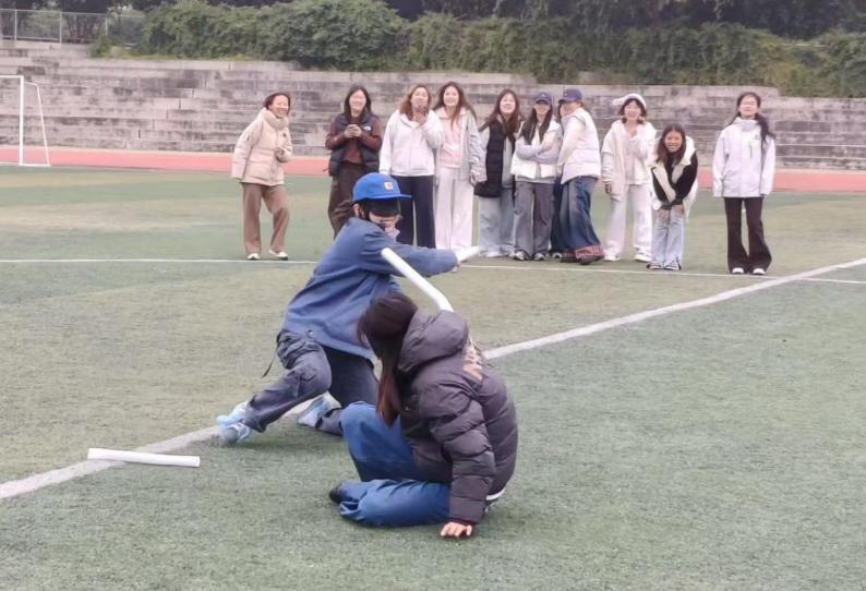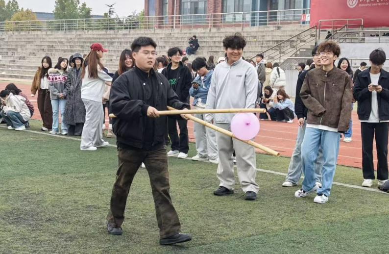 运动会设置“竹竿夹球跑”、“盲击对决”、“一圈到底”、“飞沙夺分”等兼具趣味与协作性的项目:“竹竿夹球跑”要求节奏配合,选手需持竿夹球同步前行;“一圈到底”要求队员们手拉手传递圆环,全程不借助手部接触,考验团队默契与协作能力。各项目紧扣“破冰”主线,有效消除了同学们之间的陌生感,欢声笑语与团队合作贯穿始终。