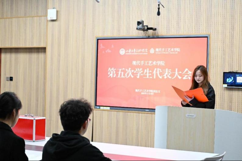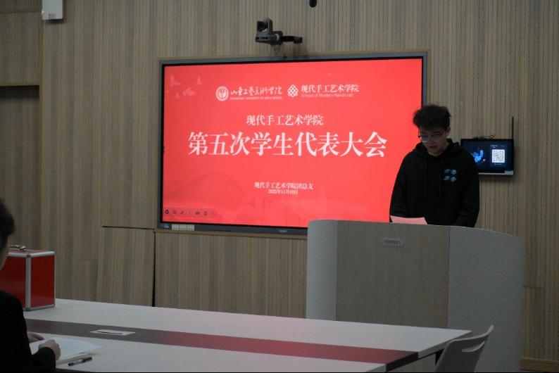 2025年11月10日,现代手工艺术学院第五次学生代表大会在学院B444多媒体会议室顺利召开。学院团总支负责人田媛老师及全体学生代表参加会议。