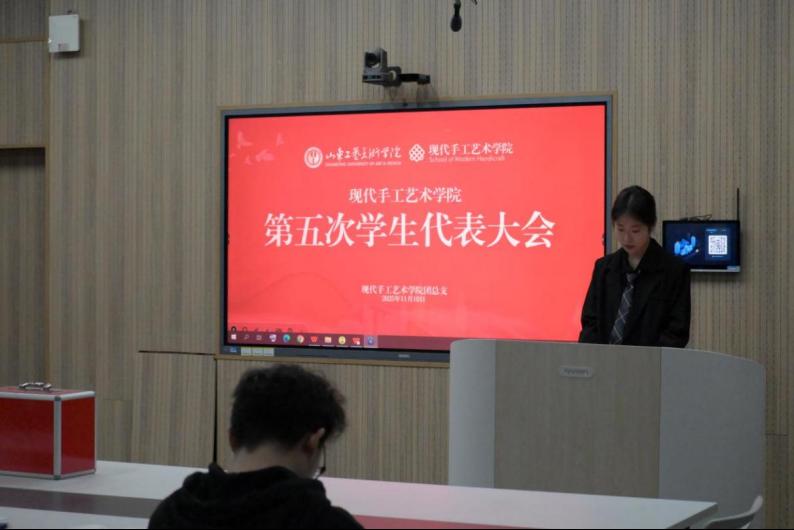 伏雪瑶就校园学习生活、基础设施建设、生活服务保障等方面,作现代手工艺术学院第五次学生代表大会提案报告。